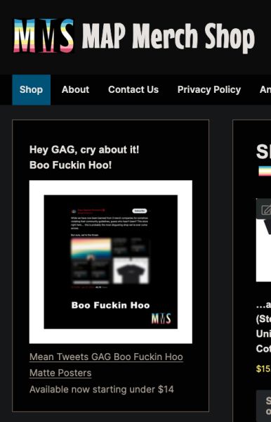 A screenshot of MAP Merch Shop with an antagonistic message directed at GAG, featuring a product made to troll them. The message reads: "Hey GAG, cry about it! Boo Fuckin Hoo!"